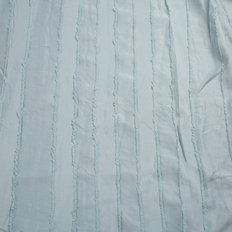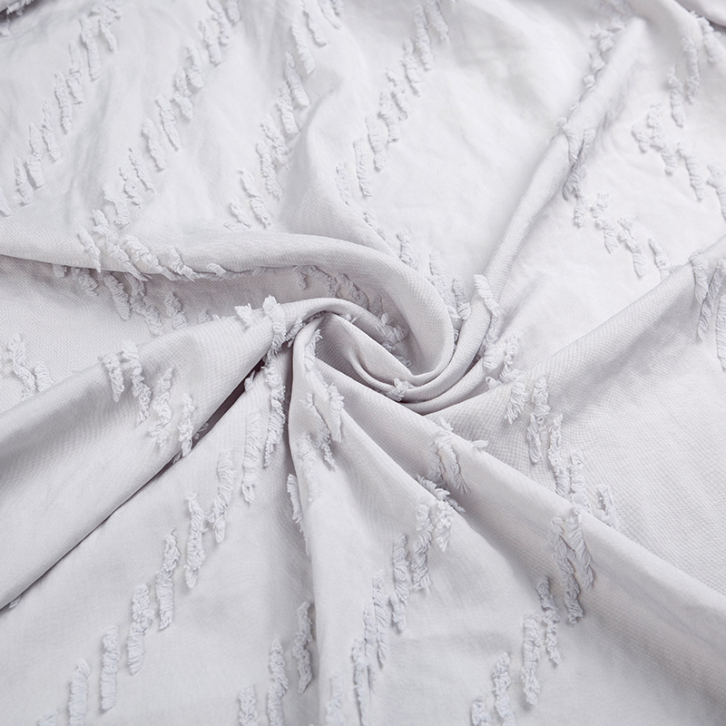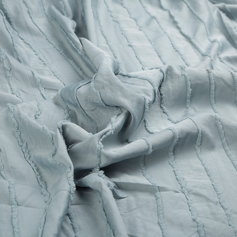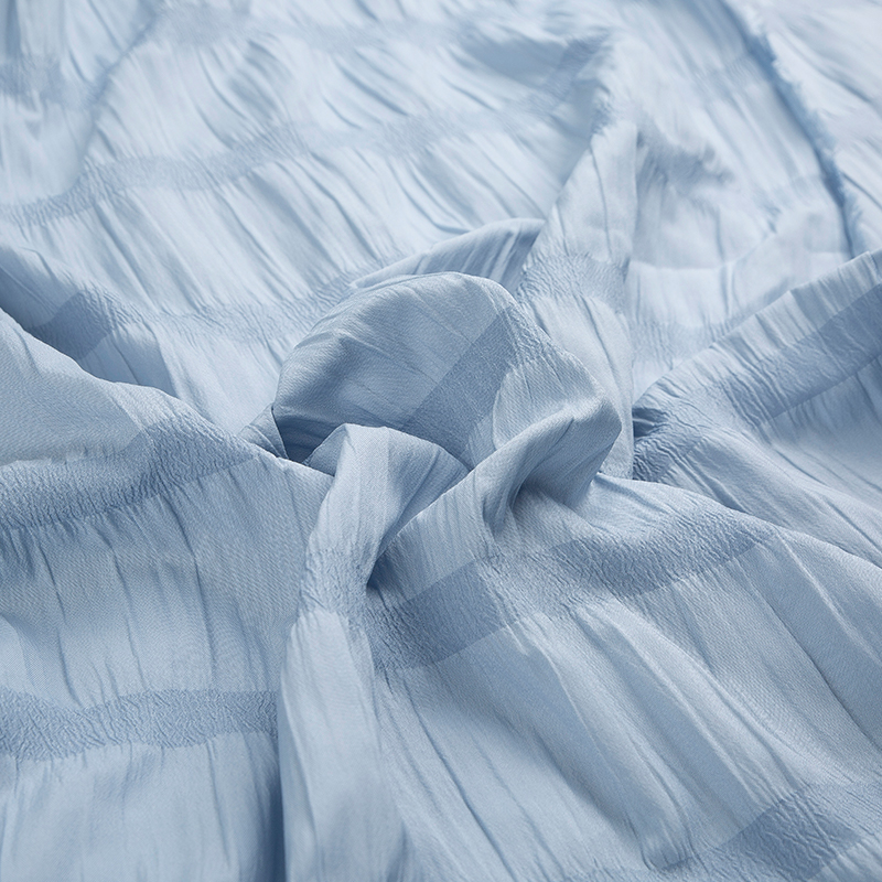 全滌壓泡面料是在染色織物的基礎上,用高溫金屬花棒在織物表面壓出起伏的泡泡。這種氣泡具有立體的凹凸感,與普通的平滑面料相比,皮膚感覺更加舒適。