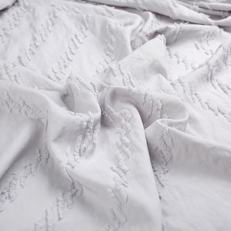 這種壓花氣泡面料是由99.99%的聚酯長絲織成的。灰色織物表面磨砂后,成品織物會變得細膩、柔軟,仿佛桃子的表皮一般。同時,滌綸織物具有更好的保溫性能。