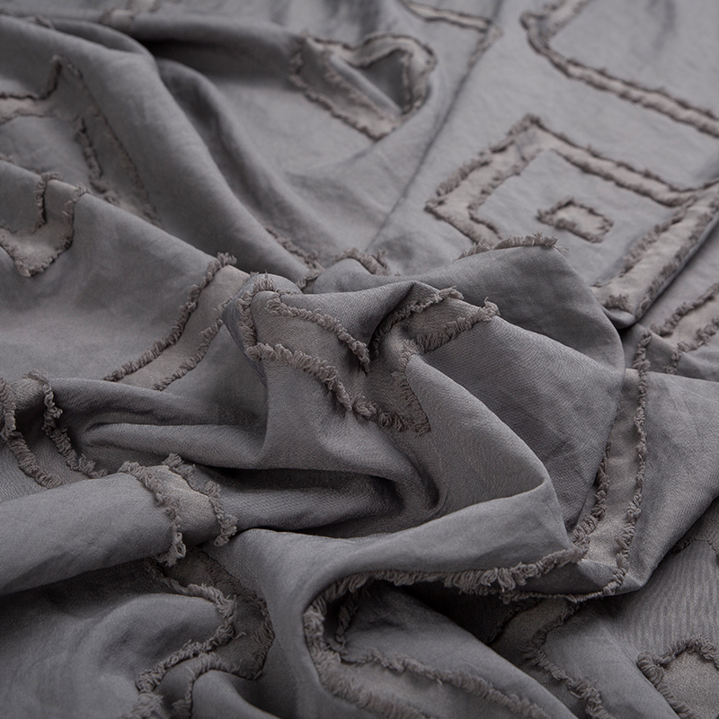 這種聚酯壓花織物是由99.99%的聚酯長絲織成的。灰色織物表面磨砂后,成品織物會變得細膩、柔軟,仿佛桃子的表皮一般。同時,滌綸織物具有更好的保溫性能。