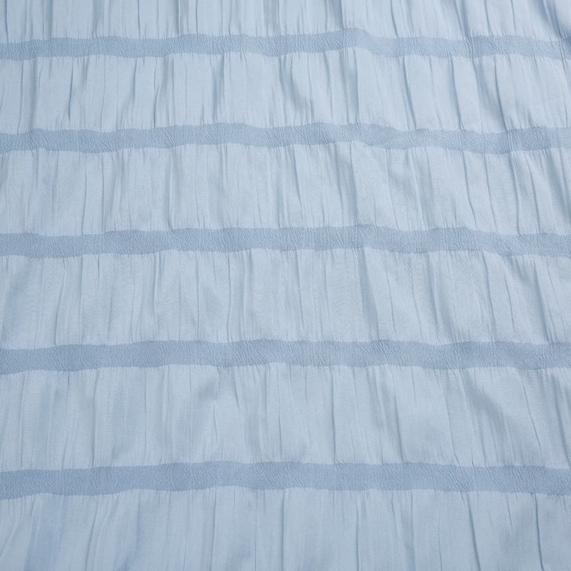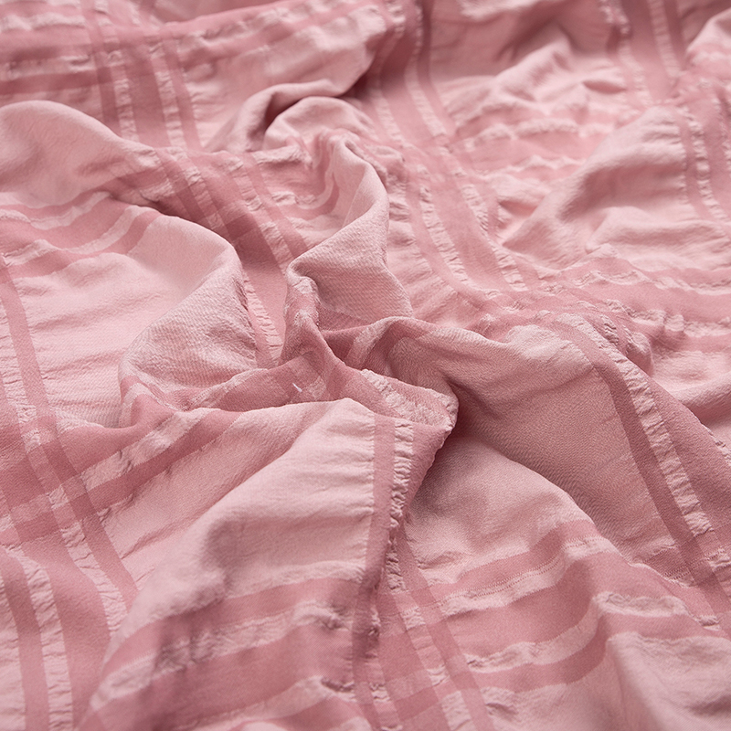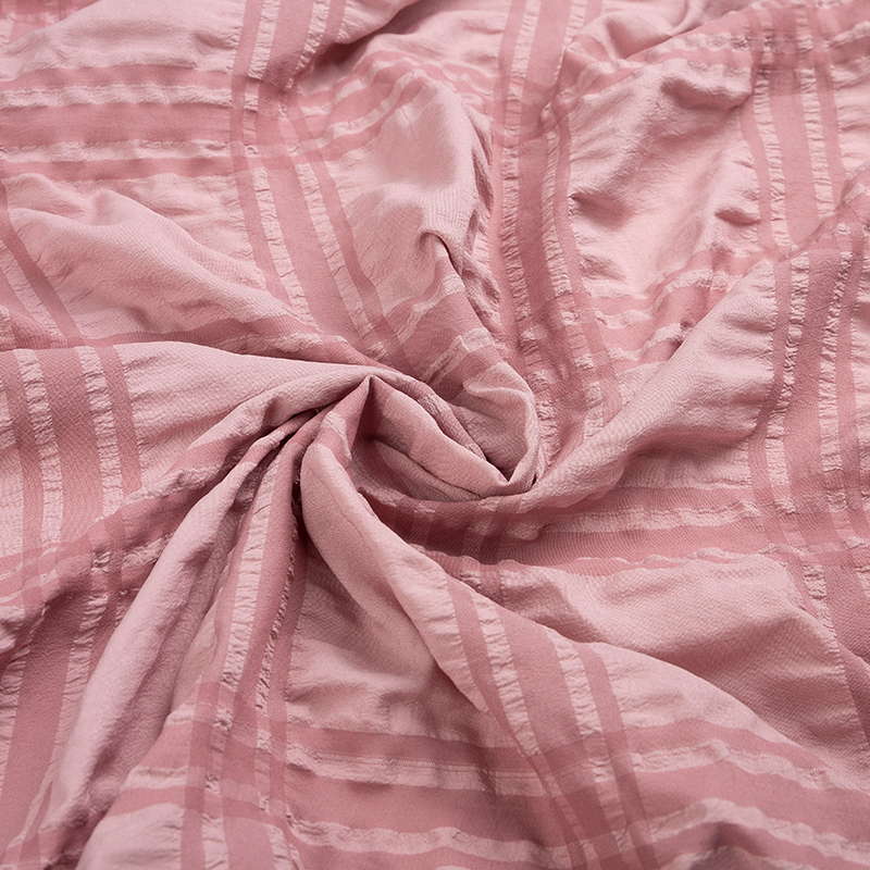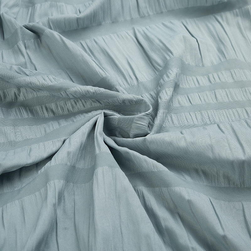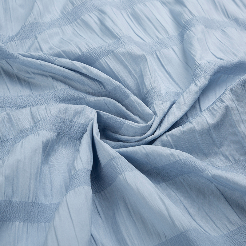 全滌泡泡紗面料是我們公司開發的最新產品。這種特殊的織物是用不同的原料組合織成的。在高溫定型過程中,不同的紗線原料表現出不同的伸縮性,最后,織物會呈現出褶皺的效果。整個織物將呈現出泡沫狀的外觀。