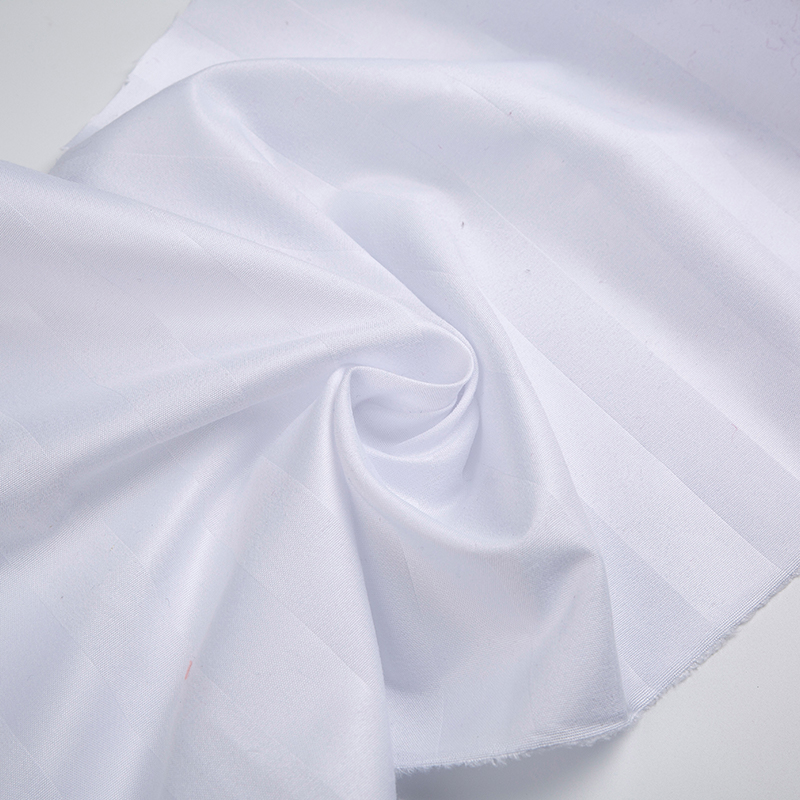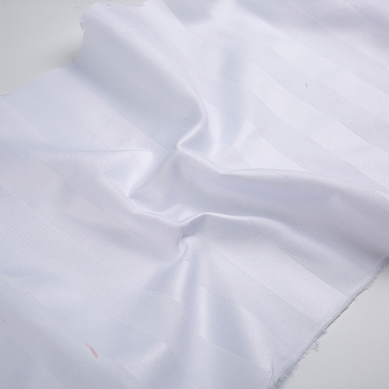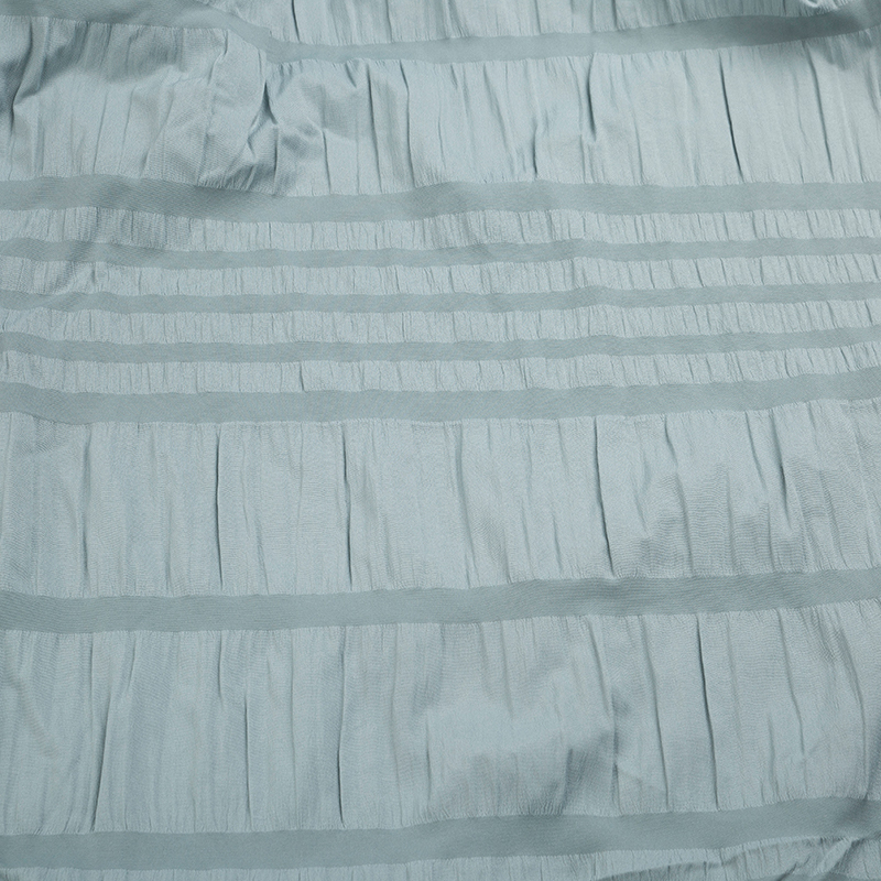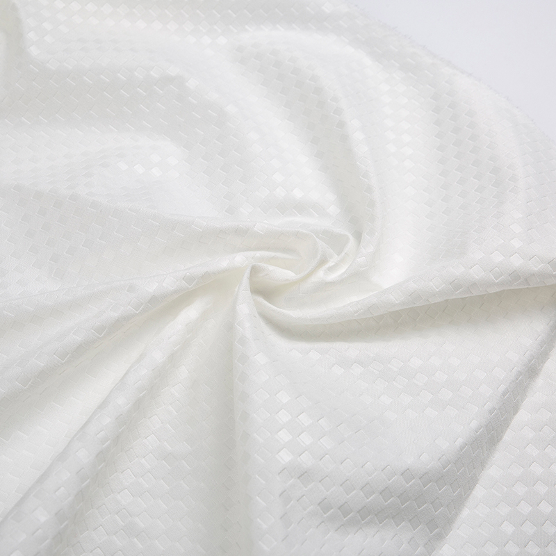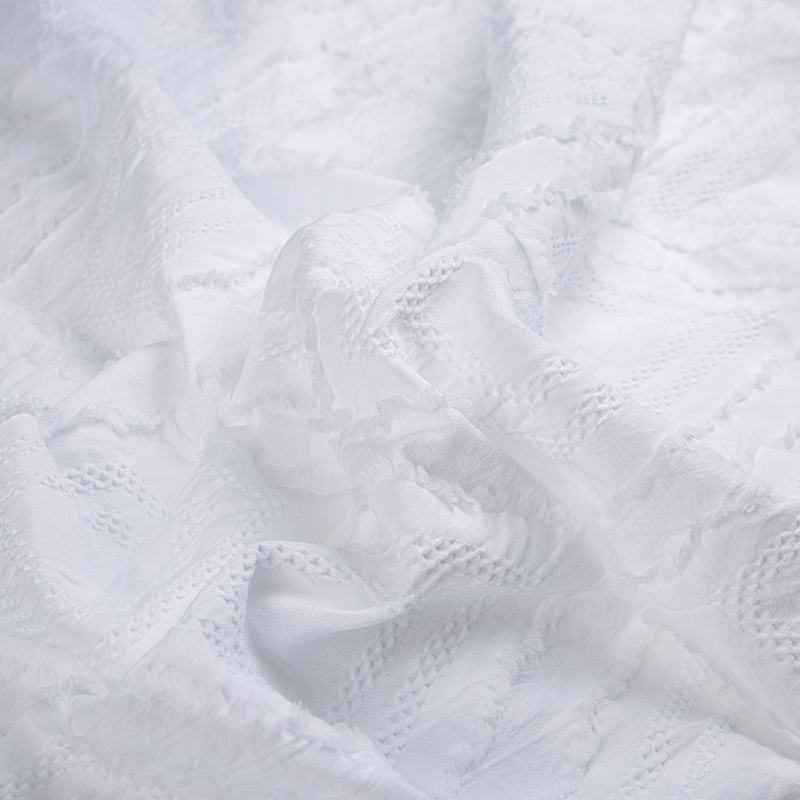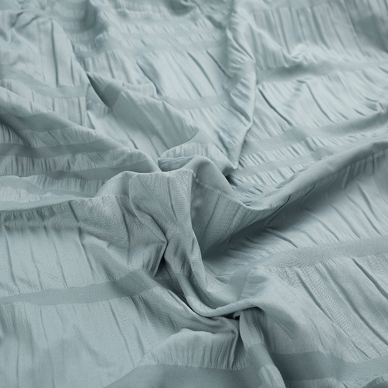 全滌泡泡紗面料是我們公司開發的最新產品。這種特殊的織物是用不同的原料組合織成的。在高溫定型過程中,不同的紗線原料表現出不同的伸縮性,最后,織物會呈現出褶皺的效果。整個織物將呈現出泡沫狀的外觀。