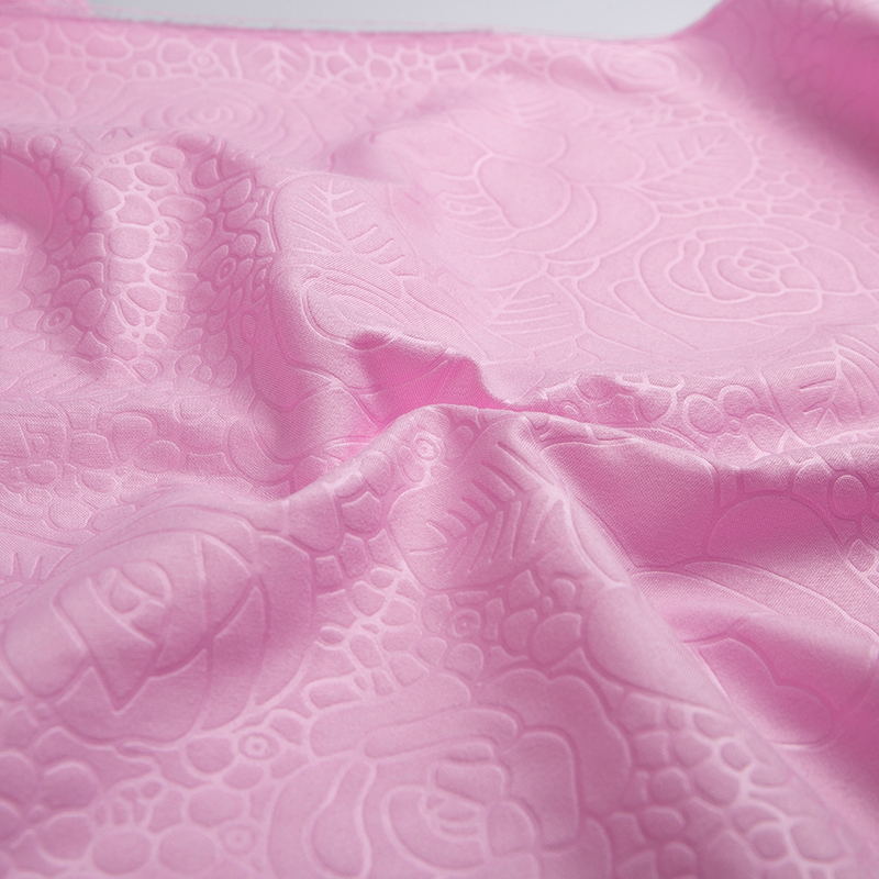 全滌壓花面料是在染色織物的基礎上,用高溫金屬花棒在織物表面壓出圖案。