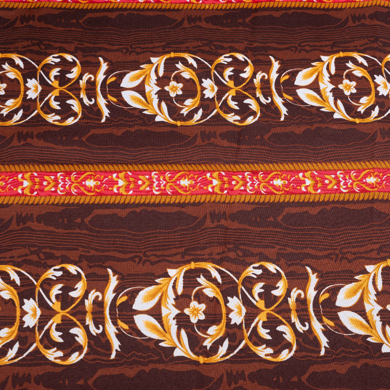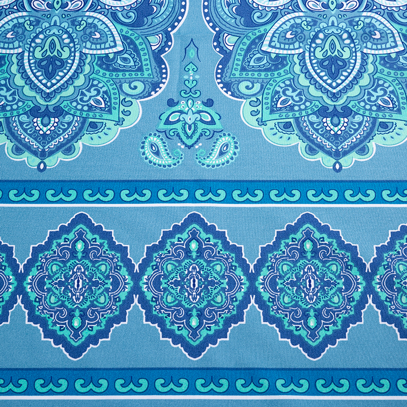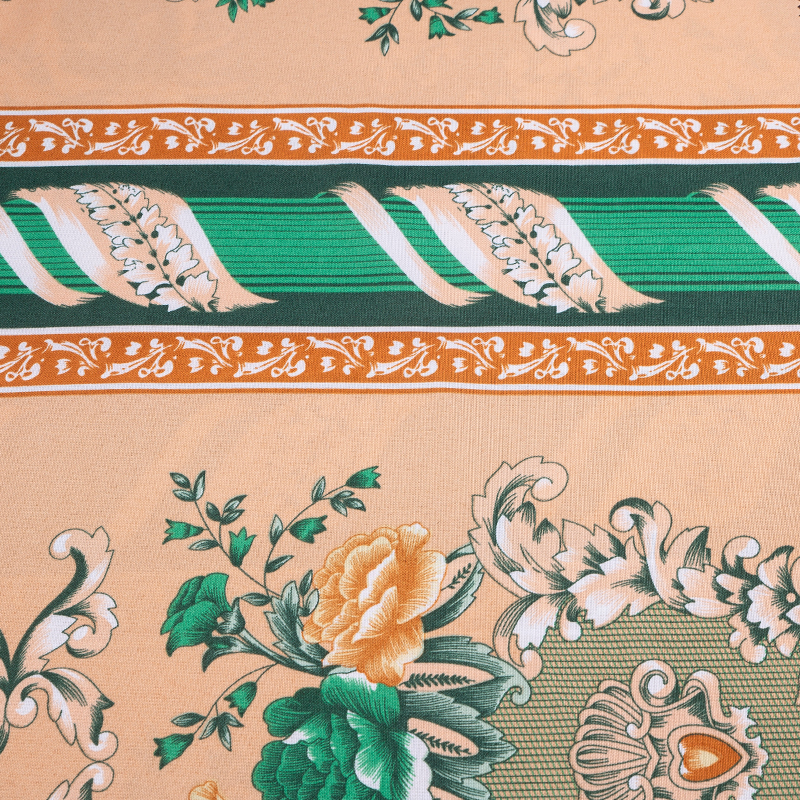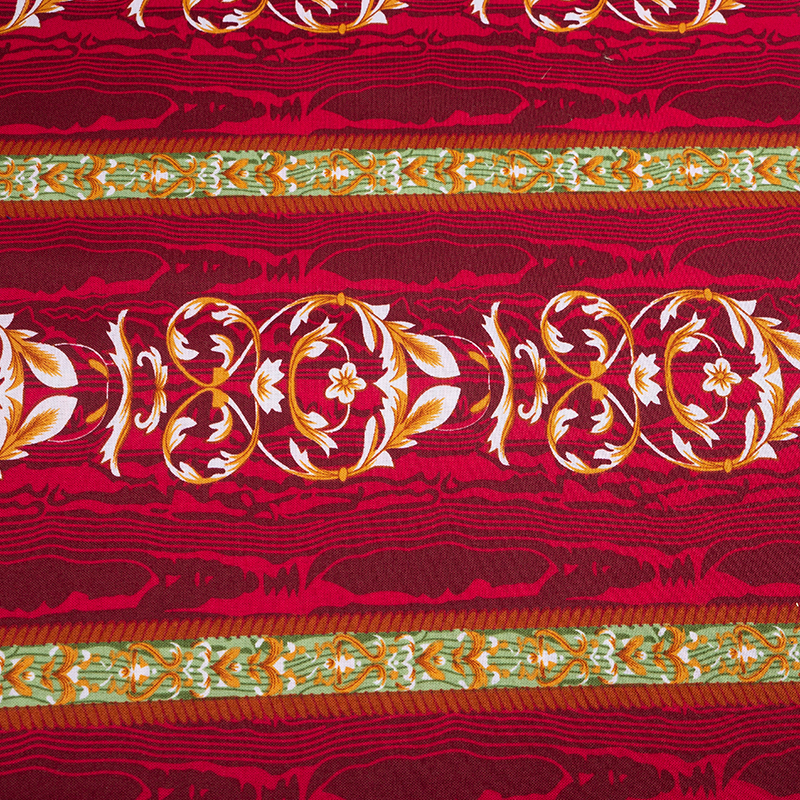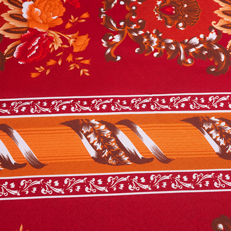 這種全滌印花面料的印刷工藝主要是顏料印刷和分散印刷。它們都是旋轉絲網印刷技術,圖案的長度可以達到64cm,寬度可以達到280cm,重量60g到140g。