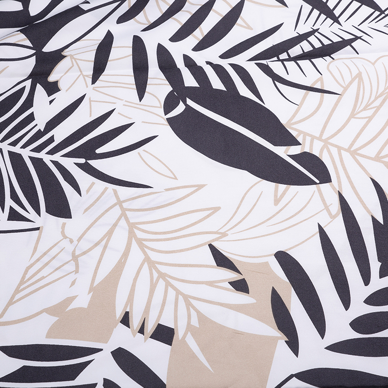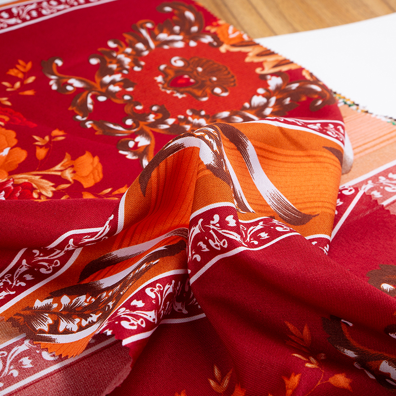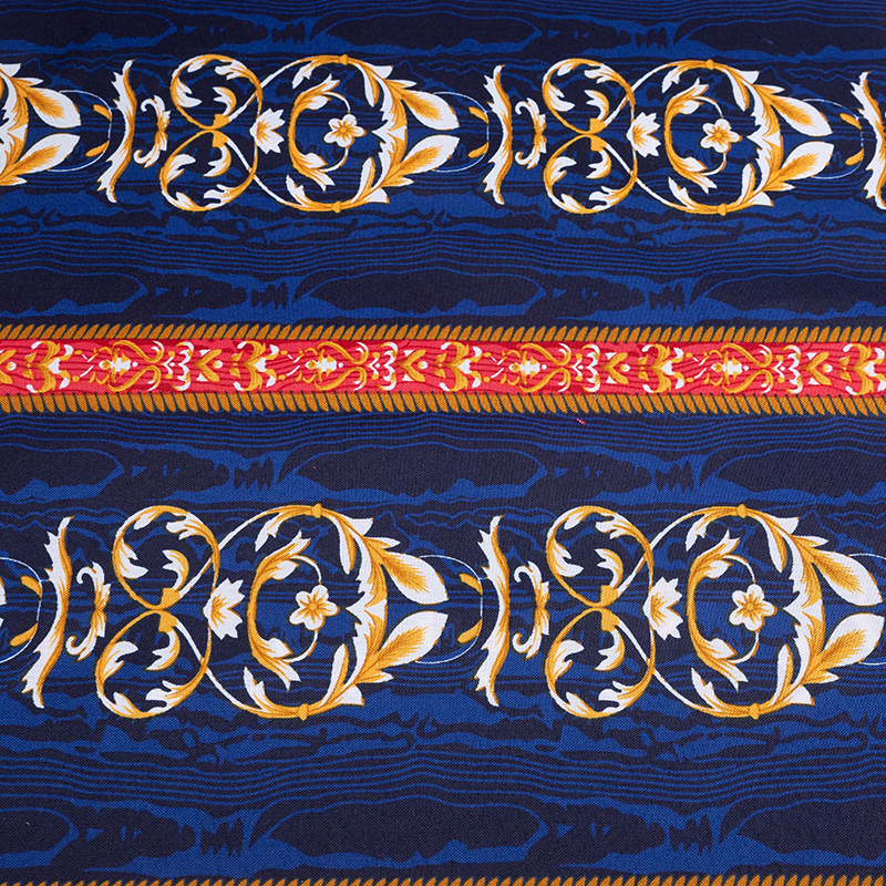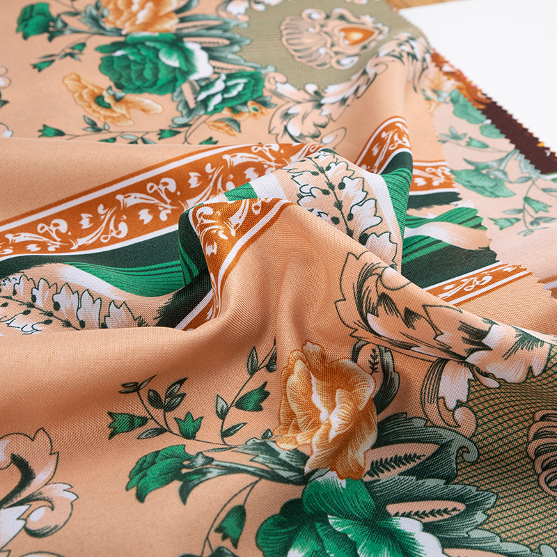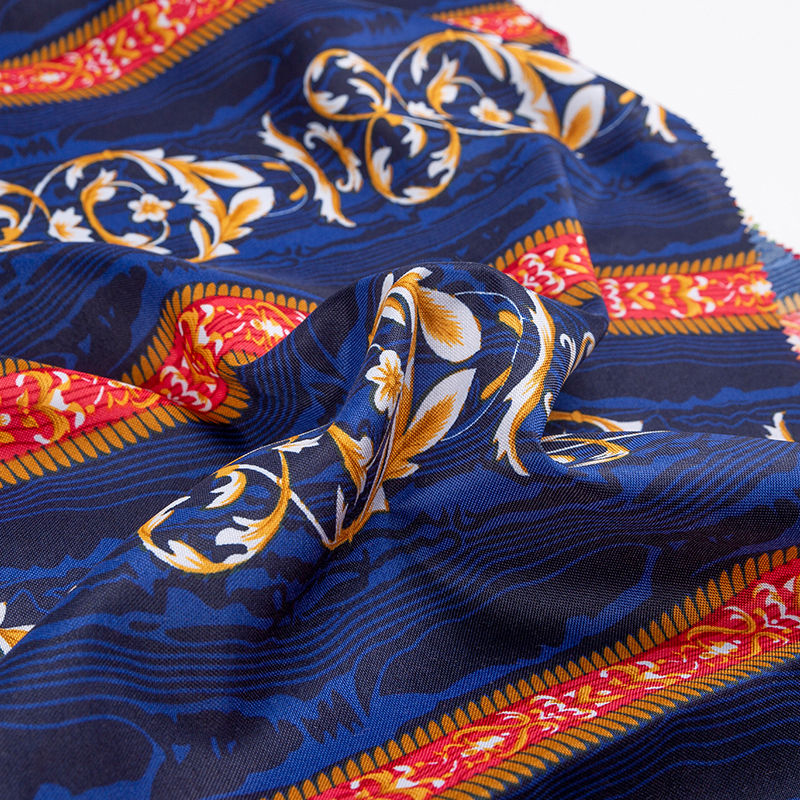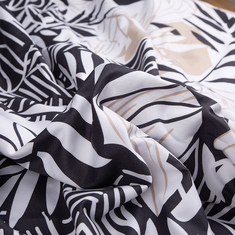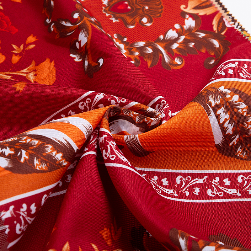 滌綸印花平紋尼是我們的新產品。是一種由99.99%的滌綸高彈性紗線原料織成的織物。它的彈性非常小,摸起來有點粗糙。