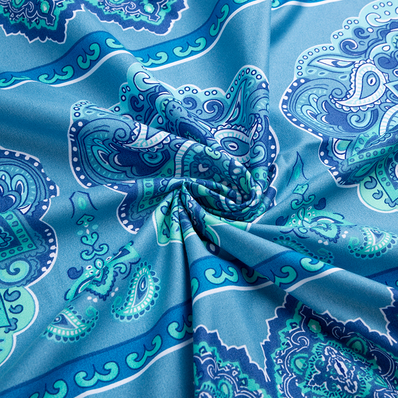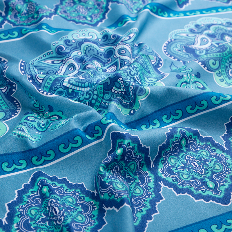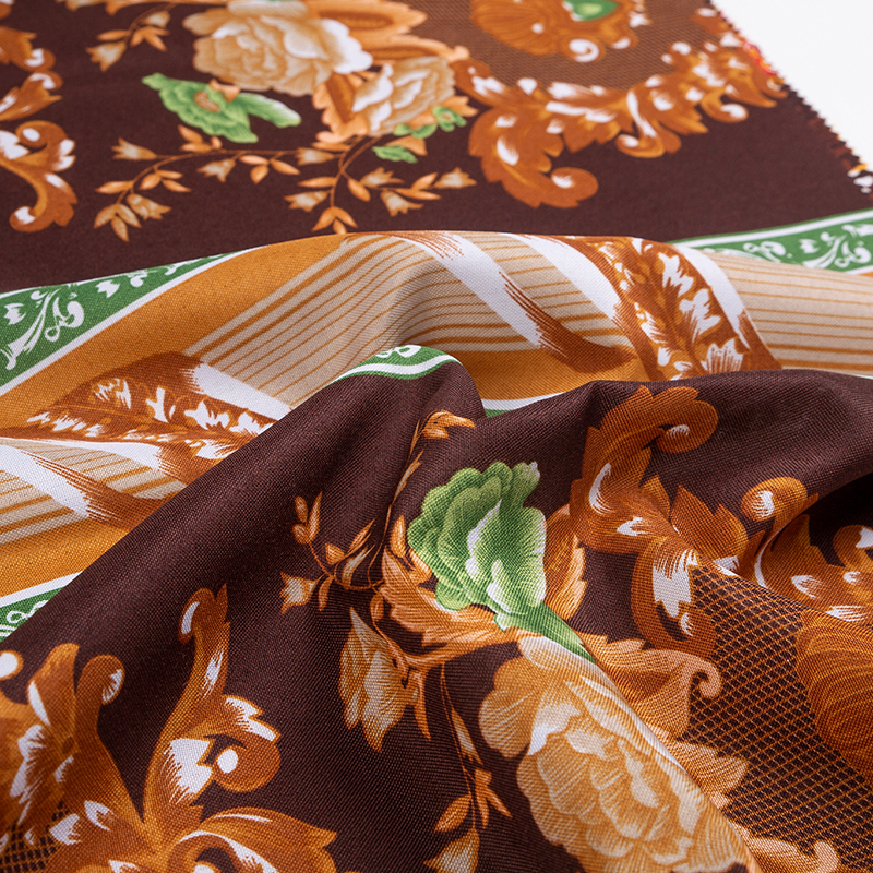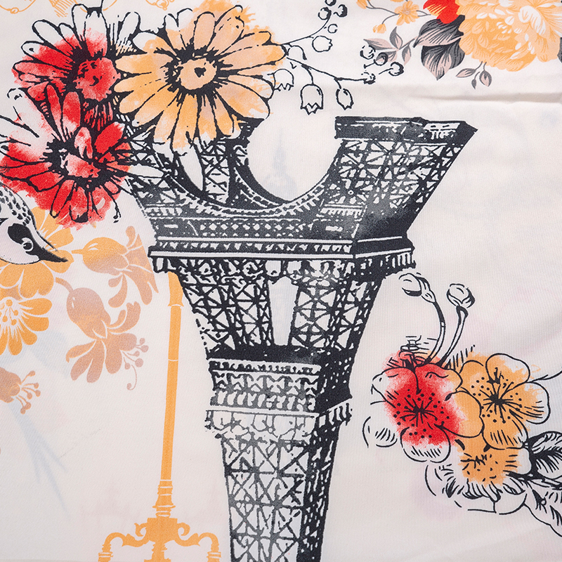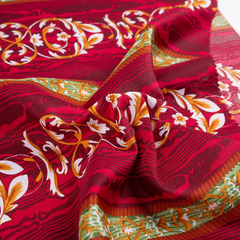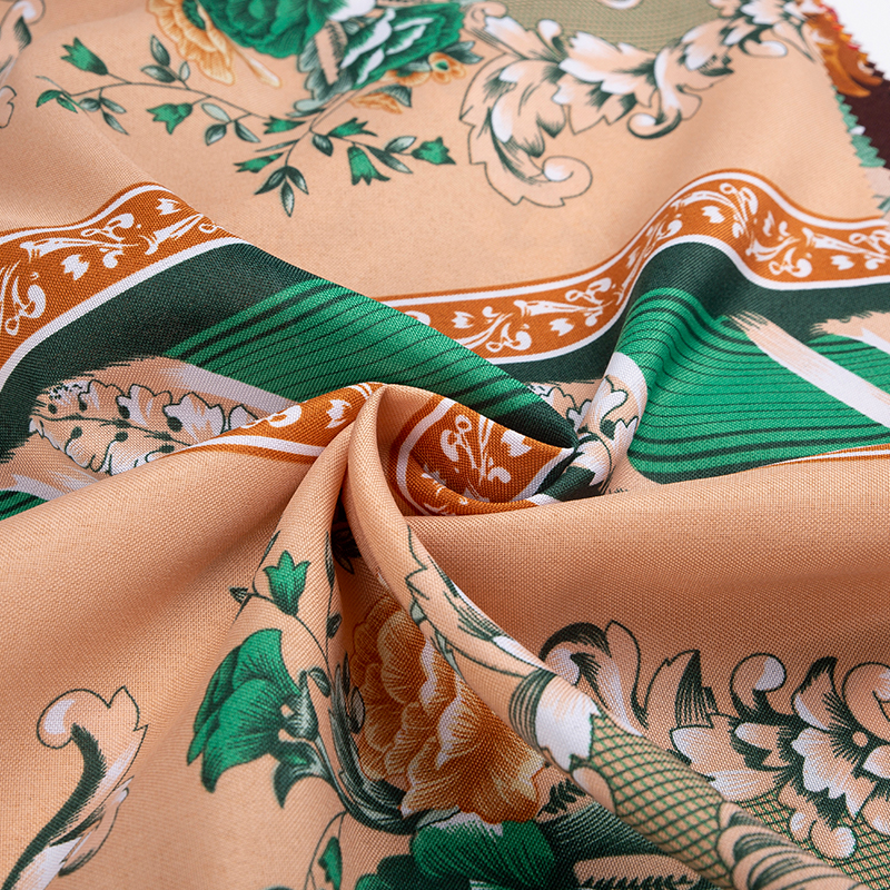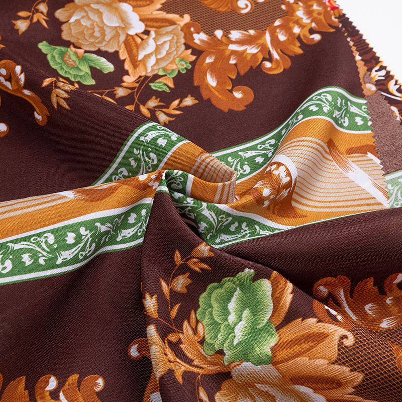 滌綸印花平紋尼是我們的新產品。是一種由99.99%的滌綸高彈性紗線原料織成的織物。它的彈性非常小,摸起來有點粗糙。