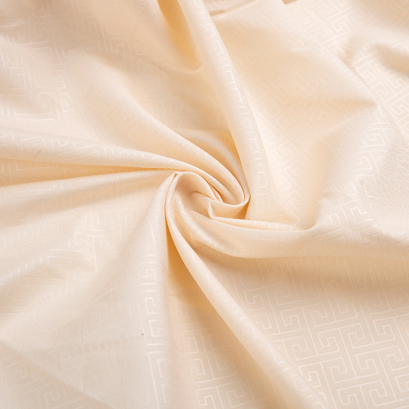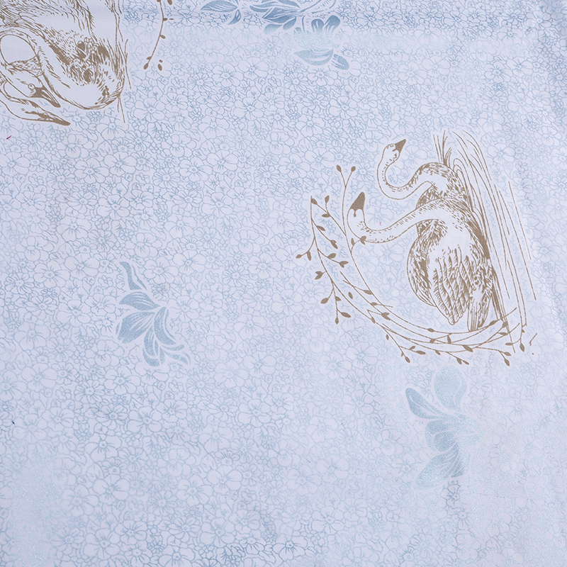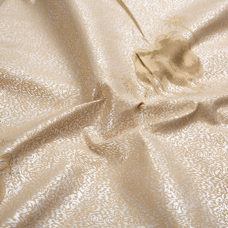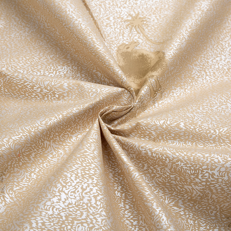 全滌燙金面料是在普通磨毛布的基礎上,在面料表面進行燙金或燙銀處理,勾勒出簡單的圖案。燙金圖案會呈現出金色或銀色的光澤,使織物看起來更加華美。